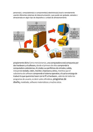 Un computador funciona mediante circuitos integrados de transistores microscópicos que reaccionan a impulsos eléctricos representados por ceros y unos del sistema binario. Los computadores actuales pueden traducir palabras, números e instrucciones a bits binarios para procesar la información. Una computadora recibe datos, los procesa y convierte en información útil mediante la ejecución de programas de instrucciones ordenadas.
