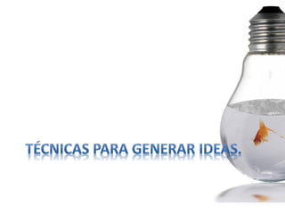 Este documento presenta 14 formas de generar ideas basadas en el libro de Jack Foster. Algunas de las técnicas propuestas incluyen divirtiéndose, pensando como un niño, obteniendo más datos, combinando elementos de manera nueva y definir el problema de manera creativa. El objetivo general es fomentar la curiosidad y el pensamiento divergente para producir nuevas ideas de manera consistente.
