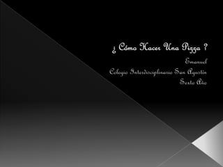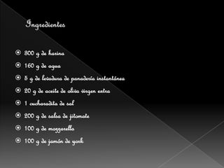 Este documento proporciona instrucciones para hacer una pizza casera. Detalla los ingredientes necesarios como harina, agua, levadura, aceite y sal para la masa. Explica cómo amasar la masa a mano o con amasadora durante 5-10 minutos hasta que esté elástica. Luego se deja fermentar la masa tapada hasta que duplique su volumen. Finalmente, se estira la masa, se agregan los ingredientes de relleno como salsa de tomate, queso y jamón y se hornea a 230°C durante 8-10 minutos hasta que