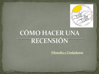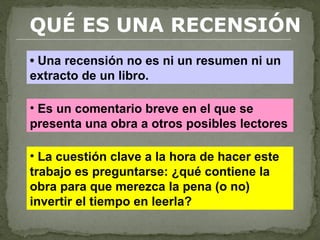 El documento habla sobre cómo hacer una recensión de un libro. Explica que una recensión no es un resumen ni extracto, sino un comentario breve que presenta la obra a posibles lectores evaluando si vale la pena leerla. Luego detalla los elementos que debe contener una recensión como una introducción, descripción del contenido, juicio sobre el estilo y valoración final. Finalmente incluye un catálogo de 4 obras para elegir y recensionar.