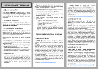 El documento ofrece instrucciones sobre cómo escribir reseñas de libros, destacando aspectos como la estructura, la presentación y el contenido que debe incluirse. Se enfatiza la importancia de valorar la obra, describir a los personajes, y recomendarla a tipos específicos de lectores. Además, proporciona ejemplos de reseñas y consejos para facilitar la tarea de escritura.