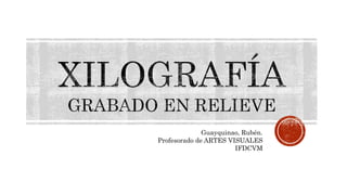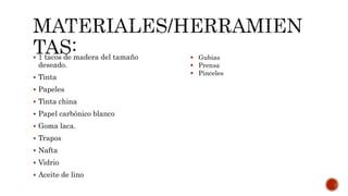 Este documento describe los pasos para crear una xilografía, incluyendo: 1) crear un boceto teniendo en cuenta limitaciones técnicas, 2) preparar la matriz de madera y transferir el boceto usando papel carbónico y goma laca, 3) desbastar la madera quitando las partes en blanco, 4) preparar la tinta con vidrio y rodillo, 5) imprimir la xilografía usando una prensa, y 6) agregar detalles de tiraje, título y artista una vez impresa.