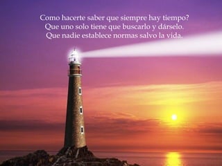 Este poema reflexiona sobre la vida y las relaciones humanas. Explora temas como el tiempo, el amor, el odio, la soledad, la muerte, la honestidad y la construcción de puentes entre las personas. Resalta que nadie establece normas sobre cómo vivir salvo la propia vida, y que es importante buscar el equilibrio entre apertura y límites para no lastimarse a uno mismo ni a los demás.