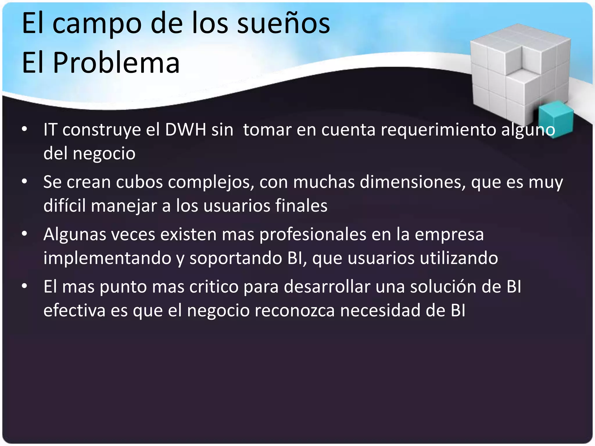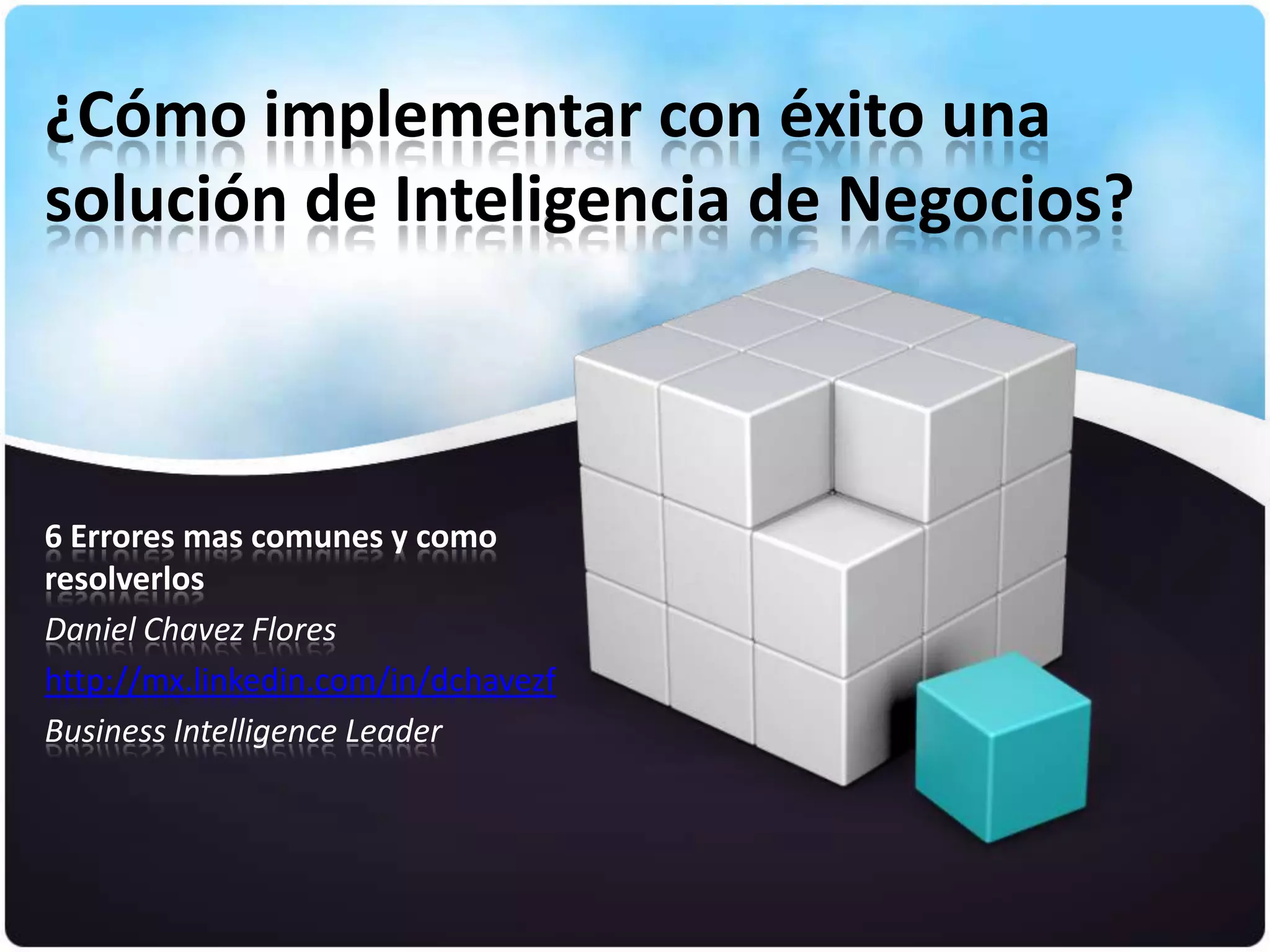 El documento aborda cómo implementar exitosamente soluciones de inteligencia de negocios (BI) y destaca errores comunes, como la falta de alineación entre IT y los requerimientos del negocio. Propone soluciones que incluyen el compromiso de la alta dirección, la creación de un centro de competencias de BI y un enfoque escalonado en la implementación. Además, subraya la importancia de la calidad de los datos y su gestión adecuada para el éxito de los proyectos de BI.