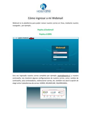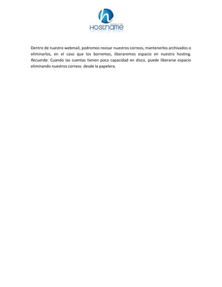 Este documento explica cómo acceder al webmail para revisar el correo electrónico en línea. Se debe ingresar la dirección de correo completa y la contraseña en la dirección webmail del proveedor o en el puerto especificado. Una vez autenticado, se podrá configurar opciones de cuenta, elegir entre plataformas de correo y revisar, archivar o eliminar mensajes para liberar espacio en el hosting.
