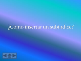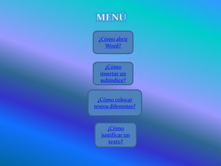 Este documento proporciona instrucciones sobre cómo abrir Microsoft Word, insertar subíndices, aplicar formatos de texto diferentes (mayúsculas, minúsculas) y justificar texto. Explica los pasos para iniciar Word, posicionar el cursor, acceder a menús de formato y numeración, y seleccionar opciones para aplicar los diferentes estilos de texto.