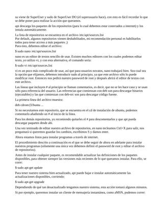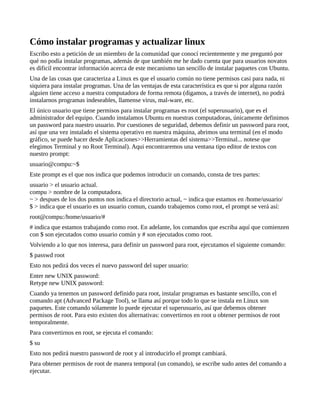 Este documento explica cómo instalar programas y actualizar Linux en 3 pasos: 1) definir una contraseña para el usuario root, 2) editar el archivo de repositorios para habilitar fuentes adicionales de paquetes, y 3) usar el comando "sudo apt-get install" seguido del nombre del paquete para instalar programas de forma segura. También recomienda actualizar periódicamente el sistema usando "sudo apt-get update" y "sudo apt-get upgrade".