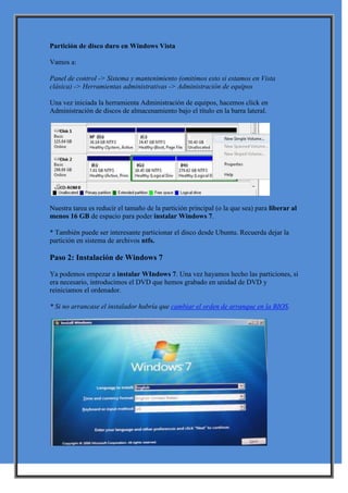 Para instalar Windows 7 en una partición, primero debes particionar el disco duro usando herramientas como Partition Magic o la administración de discos de Windows para crear espacio. Luego, inicia la instalación de Windows 7 y selecciona