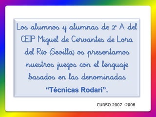 El documento incluye diversas actividades y juegos con el lenguaje realizados por alumnos de segundo del CEIP Miguel de Cervantes, basados en técnicas creativas. Presentan cuentos colectivos, rimas, la invención de palabras y oraciones divertidas. Estas actividades están destinadas a fomentar la creatividad y el interés por el lenguaje entre los estudiantes.