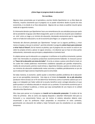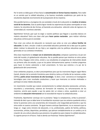 El documento resume las claves para lograr el progreso a través de la educación según el autor Andrés Openheimer. Algunas de estas claves son invertir en educación preescolar, mejorar la formación y estatus de los maestros, crear acuerdos políticos sobre reformas educativas, y romper el aislamiento educativo mediante la globalización del conocimiento. Openheimer concluye que se debe adoptar una actitud de innovación constante y humildad para reconocer los avances de otros, en lugar de complacencia, para mejorar la calidad educativa