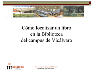 El documento explica cómo localizar un libro en la biblioteca del campus de Vicálvaro mediante la consulta del catálogo bibliográfico. Indica que se debe buscar el libro de interés en el catálogo en línea haciendo clic en "Catálogo", y proporciona detalles sobre la información relevante a tener en cuenta como la signatura, tipo de material y localización del libro. También describe los diferentes tipos de signaturas y colecciones especiales, así como el préstamo intercampus para libros ubicados en otras bibliotecas.