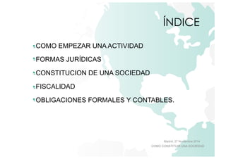 El documento describe los pasos para constituir una sociedad en España, incluyendo estudiar la viabilidad del mercado, elaborar planes de negocio, elegir entre diferentes formas jurídicas como sociedad limitada o anónima, realizar trámites de constitución y registro, cumplir con obligaciones fiscales y contables, y proporciona información sobre despachos asociados en Perú, Chile y Alemania.