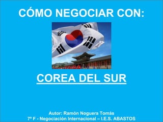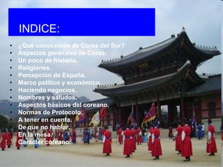 Este documento proporciona información sobre cómo negociar con Corea del Sur. Explica aspectos generales de Corea como su historia, religión, economía y cultura. También ofrece consejos sobre cómo llevar a cabo negociaciones exitosas con coreanos, incluyendo saludos apropiados, normas de protocolo cultural y factores a tener en cuenta como el significado del número cuatro. El objetivo es ayudar a los lectores a entender mejor la cultura coreana y negociar de manera efectiva.