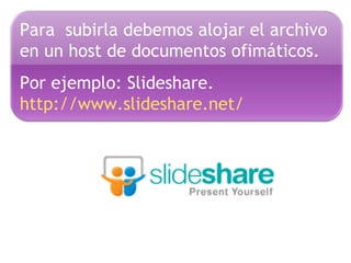Este documento proporciona un tutorial paso a paso para insertar una presentación de OpenOffice Impress o PowerPoint en un blog. Primero se debe subir la presentación a un sitio como Slideshare y crear una cuenta. Luego se copia el código de inserción y se pega en la opción de edición HTML del blog. Finalmente, se publica la entrada del blog para insertar la presentación.