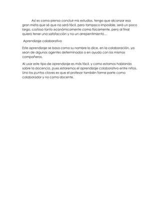 El documento describe los planes y percepciones de un estudiante sobre su carrera como profesor de matemáticas. El estudiante creció entre maestros y eligió estudiar educación. Planea enseñar matemáticas a nivel secundario y más alto, y completar una maestría y posible doctorado. Considera opciones para su especialización en Guerrero o Puebla. Su objetivo es alcanzar un nivel respetable como profesor y no arrepentirse de su decisión.
