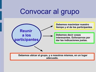 El documento ofrece consejos para presentarse ante un grupo. Recomienda maximizar el tiempo ubicando al grupo en un lugar adecuado donde todos puedan verse y escucharse. Sugiere hablar con voz clara y fuerte para que todos escuchen, y obtener silencio de forma paciente antes de hablar.