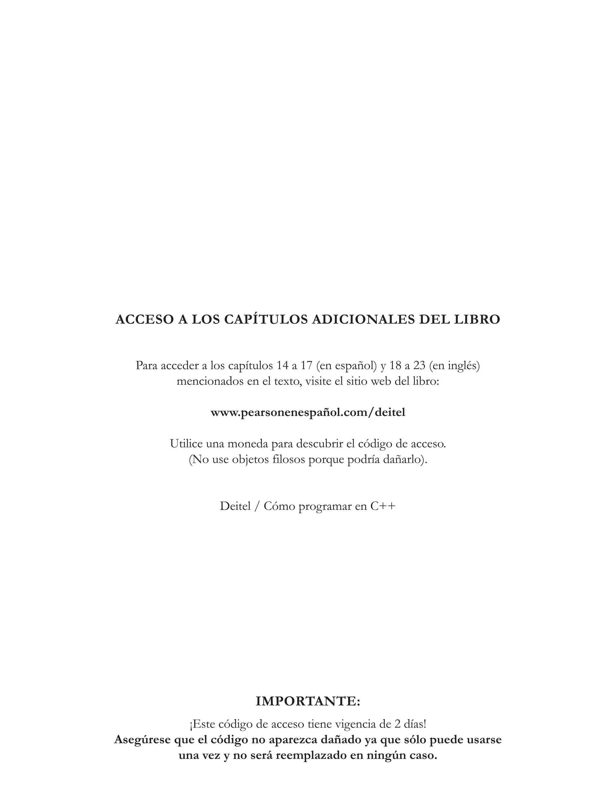 Este documento presenta un libro sobre programación en C++. El libro utiliza el método de código activo de Deitel, donde los conceptos se presentan en el contexto de programas completos en lugar de fragmentos de código. El libro cubre temas como programación orientada a objetos, el estándar C++11, apuntadores inteligentes y la biblioteca estándar de C++. El documento también proporciona información sobre cómo acceder a capítulos adicionales del libro en línea.