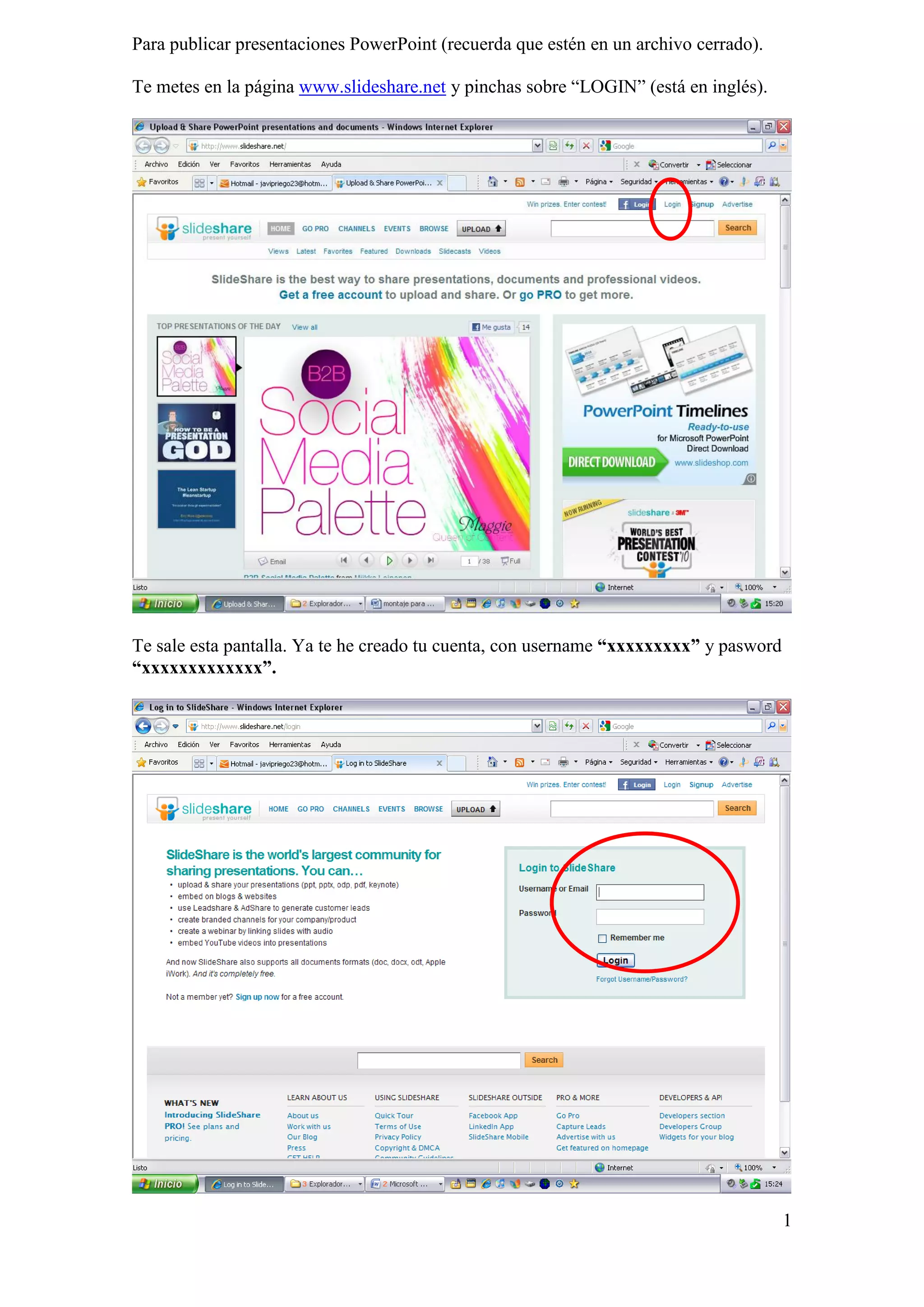 Este documento proporciona instrucciones paso a paso para publicar presentaciones PowerPoint en SlideShare y luego insertarlas en un blog. Explica cómo crear una cuenta en SlideShare, subir presentaciones, editar metadatos, y copiar el código de inserción para publicar las presentaciones en un blog.