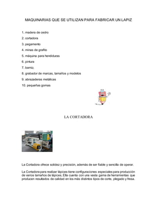 El proceso de fabricación de un lápiz consta de varios pasos: se toma un bloque de madera de cedro que se divide en tablillas, luego se les hacen hendiduras para colocar minas de grafito y se pegan juntas, después se separan los lápices individuales que son pintados, barnizados y marcados antes de afilar uno de los extremos y agregar una goma de borrar al otro. Las máquinas clave en el proceso incluyen cortadoras para dividir la madera y hacer hendiduras, así como grabadores para mar
