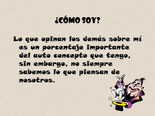 Este documento explora la autoestima y cómo se forma a lo largo del tiempo basada en cómo nos vemos a nosotros mismos y cómo creemos que nos ven los demás. También discute cómo la autoestima afecta el rendimiento y ofrece consejos como ser consciente de las similitudes con los demás, encontrar actividades que disfrutamos, y pedir ayuda cuando la necesitamos.