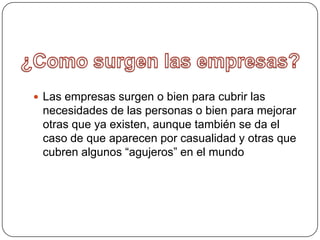 Las empresas surgen para cubrir necesidades de las personas, mejorar productos existentes, por casualidad al descubrir nuevos productos, o al identificar "agujeros" en el mercado donde un producto rentable no tiene suficiente oferta. Ejemplos incluyen una empresa veterinaria en Ezcaray para facilitar el acceso, mejoras a la imprenta de Gutenberg con la impresión digital, y el descubrimiento del microscopio al montar lentes en un tubo.