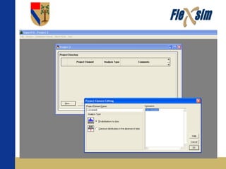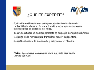 Este documento proporciona una introducción al uso de ExpertFit en Flexsim. Explica las diferentes funciones de ExpertFit como análisis de datos, ajuste de distribuciones de probabilidad, pruebas de bondad de ajuste y representación de datos y modelos en Flexsim. También describe cómo usar las pestañas Standard y Advanced para diferentes tipos de análisis, y módulos especiales como Task Time Models y Machine-Breakdown Models.