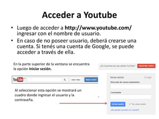 Este documento proporciona instrucciones para acceder a YouTube, subir videos, editar videos, agregar subtítulos y compartir videos. Explica cómo iniciar sesión en YouTube, seleccionar un video para subir, completar los metadatos y opciones, y editar videos ya subidos agregando efectos, transiciones o música. También cubre cómo agregar subtítulos manualmente o automáticamente y compartir videos a través de enlaces o redes sociales.