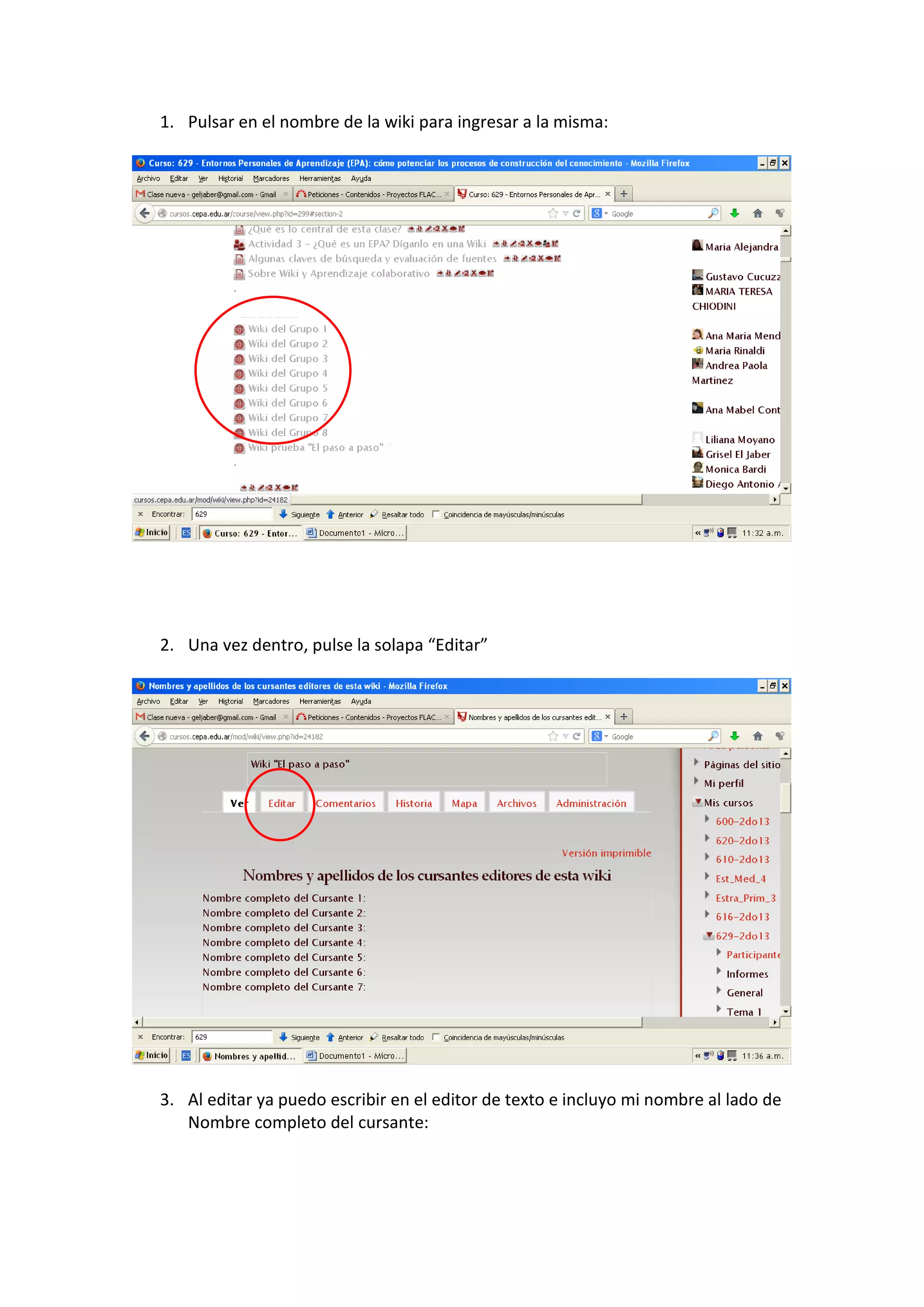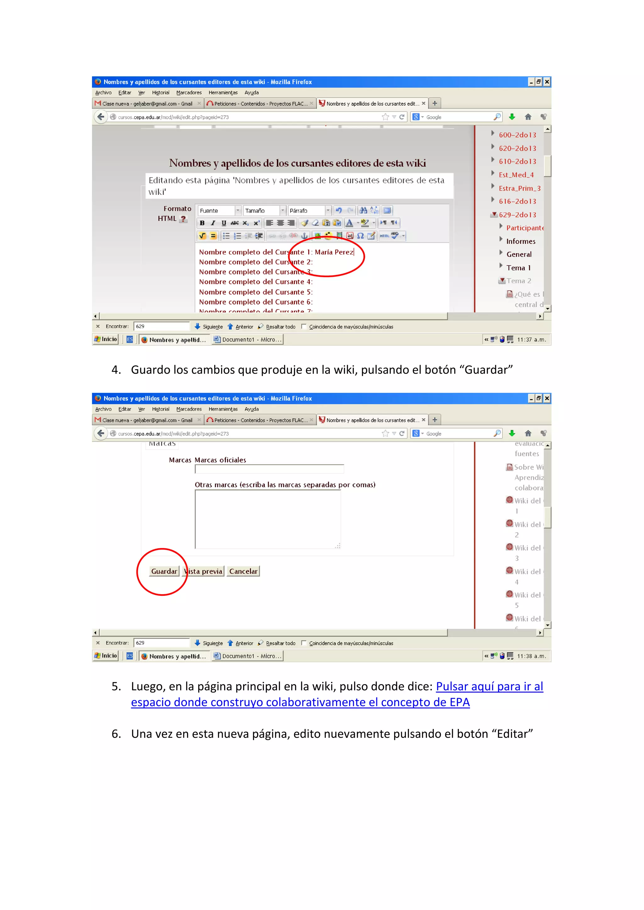 El documento proporciona instrucciones en 7 pasos para editar una wiki y contribuir colaborativamente a un concepto. Los pasos incluyen ingresar a la wiki, editar usando las pestañas, guardar los cambios, navegar a otra página para construir colaborativamente un concepto, y usar las herramientas del editor para agregar texto, imágenes y videos.