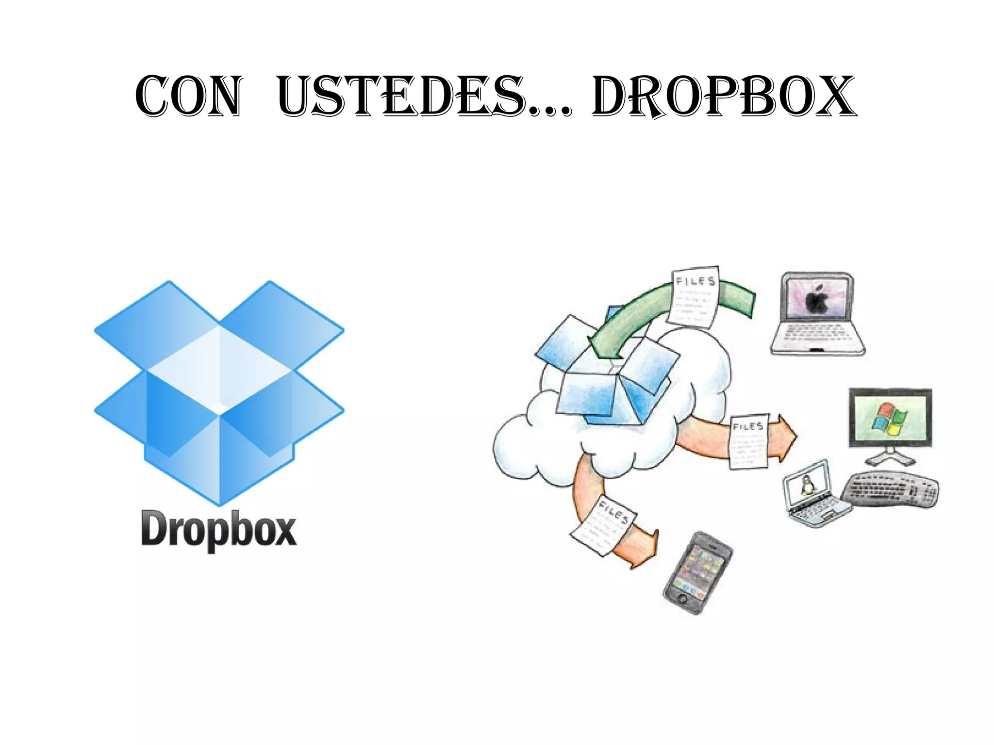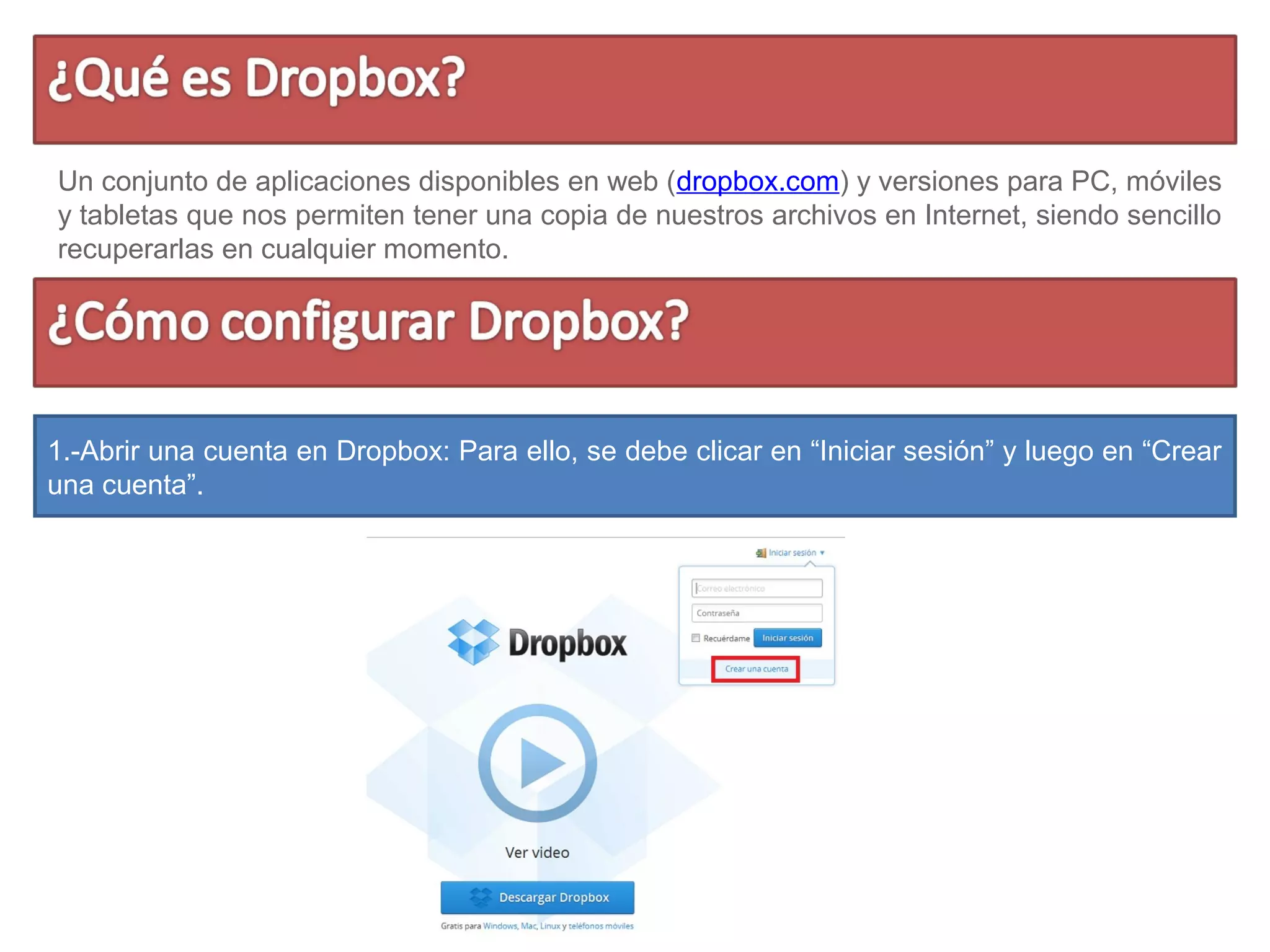 Dropbox es una aplicación disponible en la web y versiones móviles que permite tener una copia de archivos en la nube para accederlos desde cualquier lugar. Se crea una cuenta en Dropbox y se descarga e instala la aplicación, luego se sincronizan los archivos en la carpeta Dropbox y se elige el plan de almacenamiento. Los archivos en la carpeta Dropbox se envían a la nube y pueden accederse desde cualquier dispositivo luego de iniciar sesión.