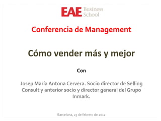 En la conferencia sobre gestión de ventas, Josep María Antona Cervera plantea la posibilidad de mejorar el rendimiento del equipo actual a través de la reflexión sobre el proceso de ventas, enfatizando la centralidad del cliente y la necesidad de establecer objetivos claros y cuantificables. Se sugiere auditar el proceso comercial, revisando aspectos estructurales y operativos para identificar áreas de mejora, mientras se debe implementar un seguimiento adecuado para asegurar la efectividad de las acciones. Finalmente, se destaca la importancia de una comunicación efectiva y el uso de herramientas adecuadas en la gestión de ventas.