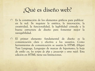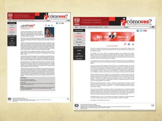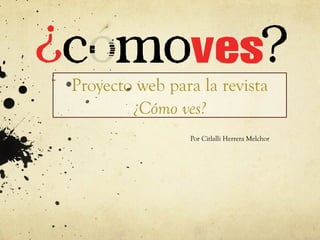 Este documento describe los elementos fundamentales del diseño web para una revista llamada "¿Cómo ves?". Explica que el diseño web implica la construcción de elementos gráficos para publicar en línea de manera estética, funcional y navegable. También habla sobre las herramientas como HTML, CSS y JavaScript que se usarán, y los elementos esenciales como el contenido, menú, encabezado y banners. Finalmente, detalla el proceso de diseño que incluye conversaciones con el cliente, bosquejos iniciales y una estructura que permita una