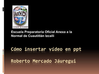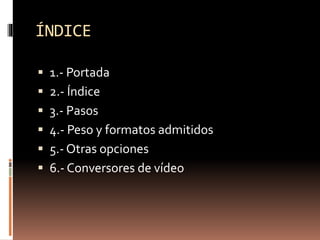 Este documento describe los pasos para insertar un video en PowerPoint. Explica que para insertar un video hay que ir a la pestaña "Insertar", seleccionar "Clip multimedia" y luego "Película". También habla sobre los formatos y pesos admitidos por PowerPoint para videos, y menciona opciones como usar un hipervínculo o un conversor de video si el archivo excede el peso permitido.