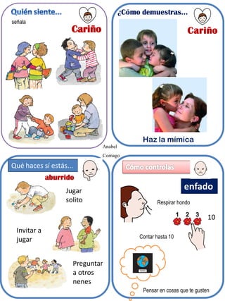 Este documento presenta una serie de tarjetas para enseñar habilidades sociales y emociones a niños. Las tarjetas cubren temas como identificar y regular emociones propias y de los demás, asociar emociones a situaciones, y cómo expresar emociones mediante gestos y acciones. El objetivo es ayudar a los niños a reconocer y manejar mejor sus emociones.