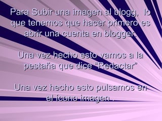 Para subir una imagen a un blog de Blogger, primero se debe abrir una cuenta en la plataforma y luego acceder a la pestaña "Redactar" de un artículo. Una vez ahí, se hace clic en el ícono de imagen y se selecciona el archivo deseado, el tamaño y lugar en el que aparecerá dentro del blog; la imagen quedará insertada en el artículo.