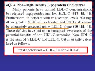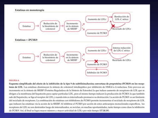Este documento resume los principales tipos de dislipidemias. Explica que existen 5 tipos principales de lipoproteínas y describe sus funciones y composiciones. Luego describe las vías metabólicas de los lípidos y las apolipoproteínas involucradas. Finalmente, clasifica las dislipidemias primarias en hipercolesterolemias, hipertrigliceridemias y hiperlipemias mixtas, detallando los tipos más comunes dentro de cada categoría como la hipercolesterolemia familiar y la deficiencia de lipoproteí