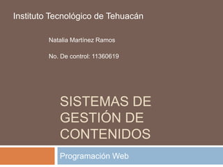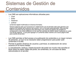Este documento describe los sistemas de gestión de contenidos (CMS). Los CMS permiten crear, editar, gestionar y publicar contenido digital de forma dinámica. Permiten reducir los costos de mantenimiento de sitios web al actualizar contenido sin modificar cada página. Los CMS más populares son Wordpress, Drupal y Joomla, que son de código abierto y gratuitos. Otros CMS como Plone y Magnolia también son de código abierto pero con un enfoque más enfocado a sitios corporativos y contenido multimedia.