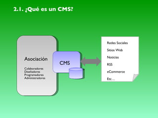 Un CMS (sistema de gestión de contenido) es una aplicación que permite a usuarios colaborar y gestionar contenido web de forma controlada. Un CMS permite añadir, editar, actualizar y eliminar contenido de un sitio web. Los CMS se clasifican por lenguaje de programación como PHP o Java, y por licencia como código abierto o comercial. La selección de un CMS depende de factores como su licencia, facilidad de uso, funcionalidad y soporte.