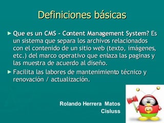 Este documento define y explica varios tipos de sistemas de gestión de contenidos (CMS), incluyendo qué es un CMS, por qué alguien usaría un CMS, cómo decidir qué CMS usar, qué son los portales CMS, los sistemas basados en páginas, módulos y objetos, los grupos de trabajo (groupware), blogs y sistemas de gestión de documentos (DMS).