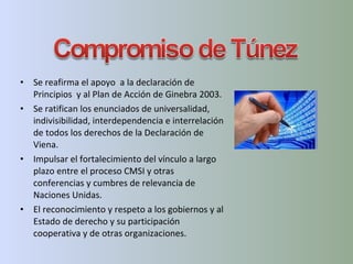 El documento reafirma el apoyo a la declaración de Principios y al Plan de Acción de Ginebra de 2003 y ratifica los derechos universales, indivisibles e interdependientes declarados en Viena. Se propone fortalecer el vínculo entre el proceso CMSI y otras conferencias de Naciones Unidas e impulsar la participación cooperativa de gobiernos, organizaciones y sociedad civil en el desarrollo de las TIC para promover el conocimiento, la educación, la salud y la ciencia. También se busca eliminar la brecha digital, prote