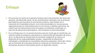 El documento presenta los componentes fundamentales del nuevo currículo de Guatemala, incluyendo su enfoque, fundamentos, principios, políticas, fines y características. El currículo se centra en la persona humana y su desarrollo integral, fomentando la equidad, pertinencia, sostenibilidad, participación y pluralismo. Sus fines incluyen el perfeccionamiento de la persona y los pueblos de Guatemala, el fortalecimiento de la identidad cultural y la convivencia pacífica entre los diversos grupos del país.