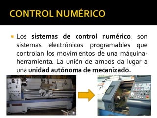Los sistemas de control numérico son sistemas electrónicos programables que controlan los movimientos de una máquina herramienta mediante motores. Permiten realizar movimientos complejos en 3 ejes de forma autónoma y precisa. Se utilizan para operaciones como fresado, torneado y taladrado, incrementando la productividad pero requiriendo mayores inversiones y conocimientos sobre programación.