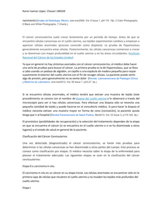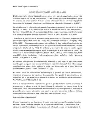 El documento trata sobre el cáncer cervicouterino en mujeres de 40 años. Explica que es el tercer cáncer más común entre mujeres y está asociado principalmente con el virus del papiloma humano. Describe las etapas del cáncer cervicouterino, los factores de riesgo, y los métodos de detección, diagnóstico y tratamiento, incluyendo cirugía, radioterapia y quimioterapia. Los factores de riesgo más importantes mencionados son iniciar la vida sexual a temprana edad, tener múltiples pare