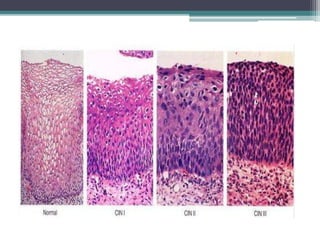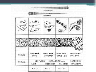 Este documento provee información sobre el cáncer cervicouterino. Explica que es una enfermedad causada por células cancerosas en el cuello uterino, usualmente asociada con el virus del papiloma humano. Detalla los síntomas, factores de riesgo, métodos de detección, clasificación por etapas, opciones de tratamiento como cirugía, radioterapia y quimioterapia, y medidas de prevención como exámenes regulares. El documento concluye que el pronóstico y tratamiento dependen de la