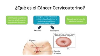 El cáncer cervicouterino se origina en las células que revisten el cuello uterino. Es causado principalmente por el virus del papiloma humano. Se detecta mediante pruebas de Papanicolaou y su tratamiento depende de la etapa, pudiendo incluir cirugía, radioterapia o quimioterapia. Es la primera causa de muerte por cáncer en mujeres mexicanas.