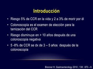 El documento describe un estudio danés que analizó 38,064 casos de cáncer colorrectal (CCR) entre 2000-2009. De estos, 982 (3%) fueron CCR de intervalo diagnosticados entre 6 meses y 5 años después de una colonoscopia previa. El estudio encontró que los CCR de intervalo eran más comunes en mujeres, ubicaciones proximales del colon, y pacientes mayores con más comorbilidades. La conclusión fue que aunque raros, los CCR de intervalo ocurren en aproximadamente el 5-8% de los casos, posiblemente debido a