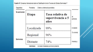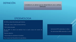 Este documento trata sobre el cáncer de testículo. Define el cáncer de testículo, discute su epidemiología, factores de riesgo, etiología, patología, marcadores tumorales, diseminación, estadificación, clínica, diagnóstico por imagen y tratamiento. Explica que el cáncer de testículo se origina principalmente en las células germinales y que existen dos tipos principales: seminomas y no seminomas.