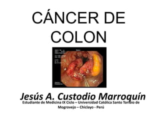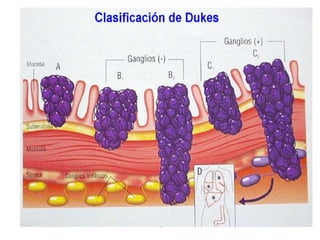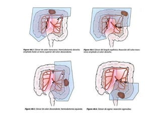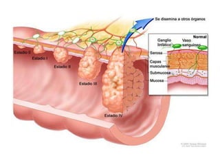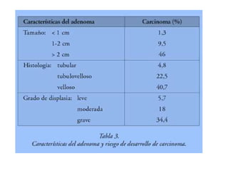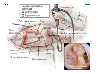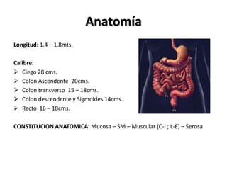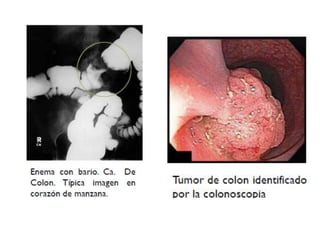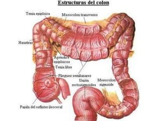 Este documento describe la anatomía, epidemiología, manifestaciones clínicas, diagnóstico y tratamiento del cáncer de colon y la enfermedad diverticular. El cáncer de colon es la tercera causa de muerte por cáncer y se origina principalmente a partir de pólipos adenomatosos. La enfermedad diverticular ocurre cuando se forman bolsas en la pared del colon y puede complicarse con inflamación o perforación. Ambas afecciones se diagnostican mediante colonoscopia, tomografía computarizada y otros exámenes, y su