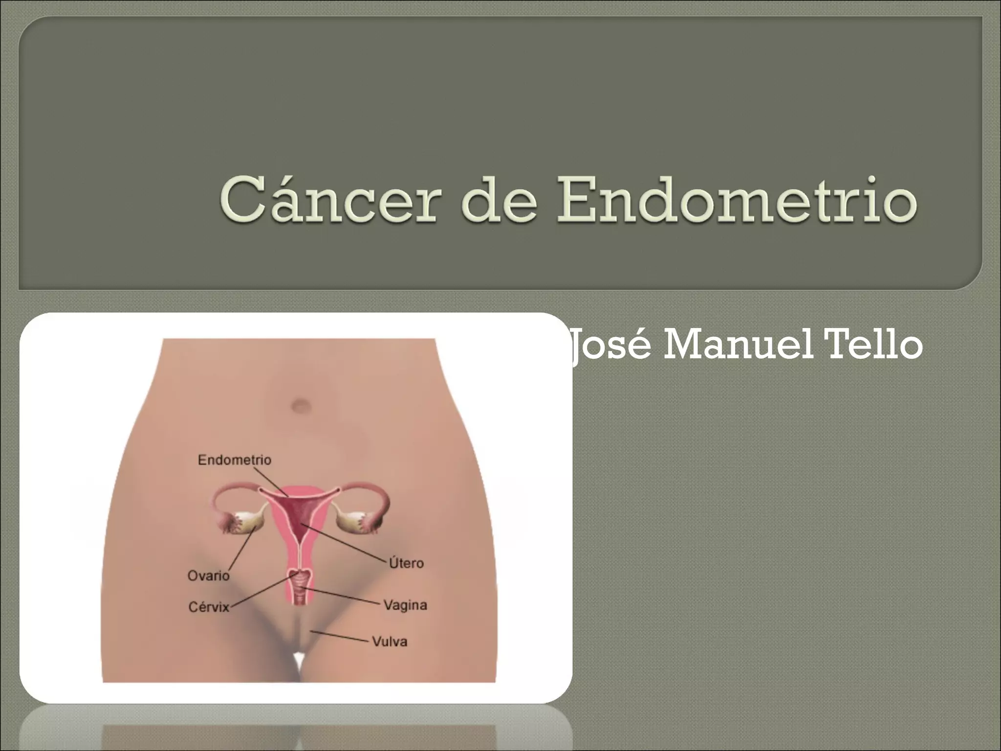 El cáncer de endometrio comienza en el revestimiento del útero. Es el tipo más común de cáncer uterino y generalmente ocurre entre los 60 y 70 años. Los factores de riesgo incluyen diabetes, obesidad e inicio temprano de la menstruación. Los síntomas pueden ser sangrado vaginal anormal o dolor abdominal. El tratamiento implica cirugía, radioterapia o quimioterapia.