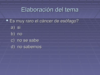 Este documento trata sobre el cáncer de esófago. Se menciona que es la quinta causa más común de cáncer de tubo digestivo en México y es más frecuente en hombres que en mujeres. Los principales tipos son el carcinoma epidermoide y el adenocarcinoma. El síntoma principal es la disfagia.