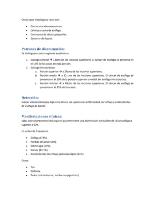 El cáncer de esófago es más común en hombres entre 60-70 años y se relaciona con factores como dieta, alcohol, tabaco y esófago de Barret. Los tipos más frecuentes son el carcinoma epidermoide y el adenocarcinoma. Se detecta mediante endoscopia digestiva alta y se estadifica considerando la extensión del tumor, ganglios linfáticos y metástasis. El pronóstico depende del estadio, siendo mayor la tasa de supervivencia en los estadios iniciales tratados con cirugía